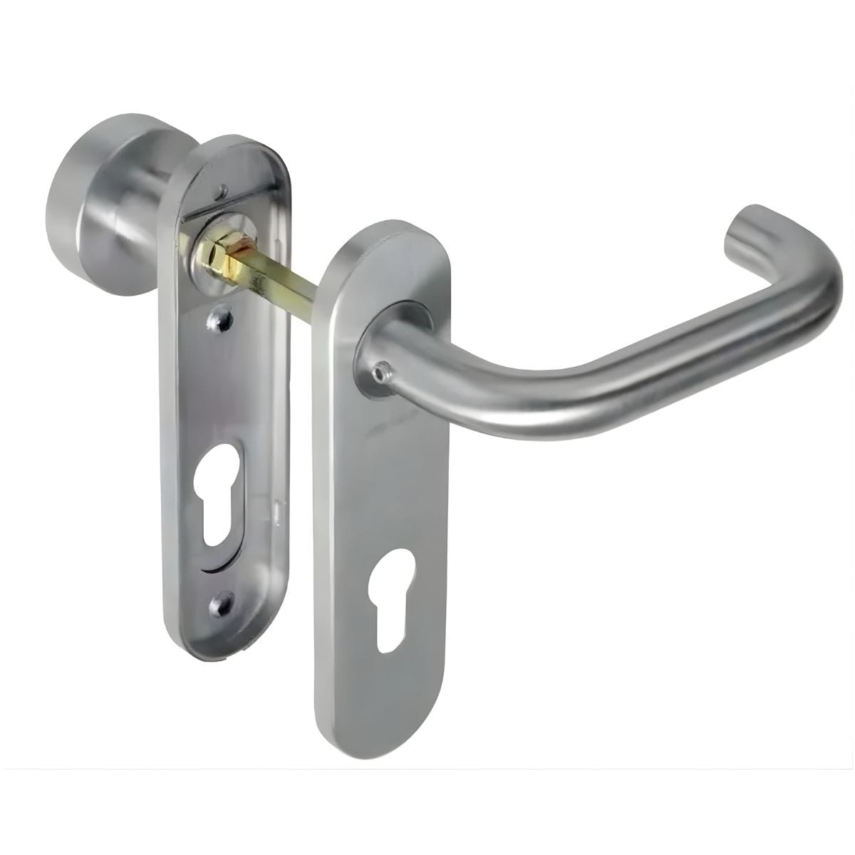 Klamka i gałka wykonane są ze stali nierdzewnej AISI 304, co zapewnia wysoką odporność na korozję, uszkodzenia mechaniczne oraz długą żywotność nawet w wymagających warunkach eksploatacyjnych.