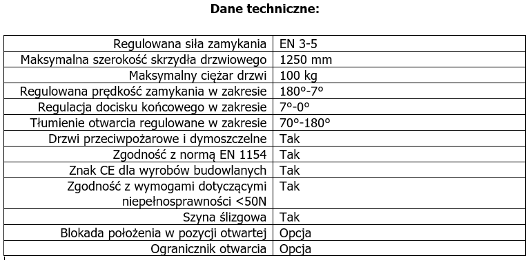 - regulowana płynnie siła zamykania w zakresie EN 3-5,