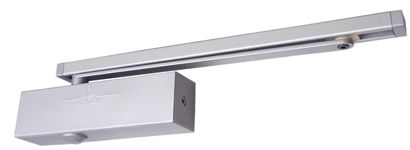 Samozamykacz szynowy dormakaba Groom 3500 G EN 3-5 z szyną, wykonany w technologii asymetrycznej przekładni zębatej ułatwiającej otwieranie, z funkcją tłumienia otwarcia (antywiatrową) i termozaworami. Siła zamykania płynnie regulowana. Przebadany zgodnie z normą EN 1154 i wymogami dotyczącymi niepełnosprawności <50N, posiada znak CE. Może być zastosowany do drzwi przeciwpożarowych i dymoszczelnych.