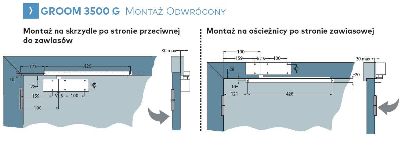 - montaż podstawowy Groom 3500 G – siłownik na skrzydle po stronie przeciwnej do zawiasów,