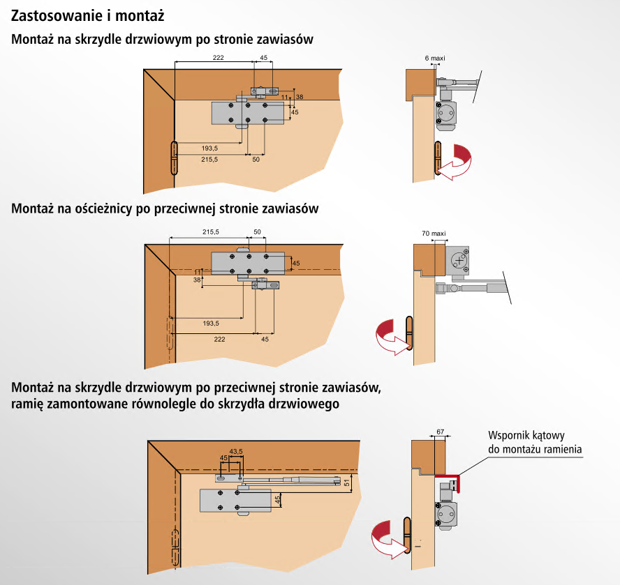 - tłumienie otwarcia regulowane w zakresie od 70° dla montażu na skrzydle drzwiowym,