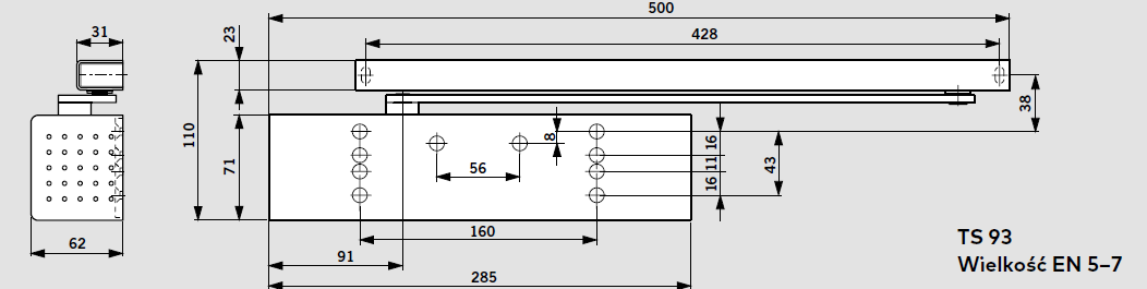 Samozamykacz szynowy dormakaba TS 93 B bez szyny, z płyktą montażową, wykonany w oryginalnej technologii krzywki sercowej (CAM ACTION) z funkcją wspomagania otwarcia EASY OPEN, tłumienia otwarcia w końcowej fazie, opóźnienia zamknięcia i z termozaworami. Siła zamykania EN 5-7 zgodnie z normą EN 1154. Może być zastosowany do drzwi przeciwpożarowych i dymoszczelnych.